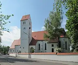 The first significant change occurred in 1880, when Pasing became its parish, with the Laim and Obermenzing branches. In 1914, Allach and Untermenzing were still part of the parish of Aubing, served by an expository priest and an assistant priest. Langwied now belonged entirely to Lochhausen, as Freiham had done since the Middle Ages.[38] The wooden church of St. Joachim and Anna in Neuaubing, consecrated in 1921, became its parish in 1922, now known as St. Konrad.[39]