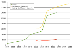 For centuries, Aubing was the most populous village west of Munich. The parish of Aubing included the neighboring villages to the east, from Allach to Laim. In neighboring Pasing, however, the population grew even faster after the construction of the railroad, so that it surpassed Aubing at the end of the 19th century. In 1942, Aubing was incorporated into Munich and constituted a borough in its own right until it was absorbed into the borough of Aubing-Lochhausen-Langwied in 1992.