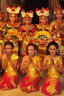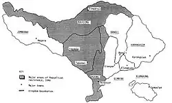 The rule of the Majapahit marks the strong influx of Javanese culture into Bali, most of all in architecture, dance and the theatre, in literature with the introduction of the Kawi script, in painting and sculpture and the wayang puppet theatre.[9] The few Balinese who did not adopt this culture are still known today as "Bali Aga" ("Original Balinese") and still live in a few isolated villages.[14]