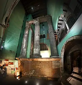 By the 2nd century, the city had the form of an oppidum[31][32][33] and a population of 3500–5000.[34] The main economic activity was cultivation of the surrounding land, and its wine was exported widely.[35] The archeological remains from the period (sculptures, mosaics, and amphorae) indicate a relatively prosperous population, although the city lacked the major public buildings (theatre, amphitheatre, circus) found in more important Roman centres such as Tarraco. The forum's most impressive building was the temple dedicated to Caesar Augustus, probably constructed at the start of the 1st century.[36] It was quite large for a city the size of Barcino, measuring 35 m by 17.5 m, and built on a podium surrounded by Corinthian columns.[37]