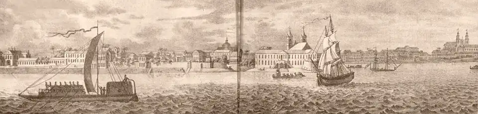 Ferreira, based on the philosophy of urbanization as a form of political control (associated with the birth of social medicine and medical architecture), proposed measures to enable the urban occupation of riverbanks, such as large works of water catchment and distribution, construction of wide streets aiming at the wide circulation of air, drainage of stagnant water in flooded areas of the city, construction of navigation and irrigation canals.[34] Whereas this conception does not destroy the fortified-city urbanization model used in the Portuguese colonization process, water management occupied a prominent place in the urban policy of the eighteenth century, associated with studies of climate and water dynamics for the land occupation.[34] The technical mastery of water was inscribed, in the Age of Enlightenment, in the valorization of agriculture, in the exploitation of natural resources, and in the circulation of goods with the development of the navy.[34]