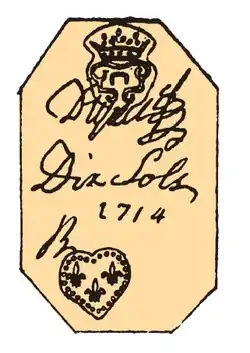 Although in short supply, French coinage continued to circulate in the 18th century, such as the 15- and 30-deniers.[14] These gold coins, known as the mousquetaire, were meant to pay soldiers and civil servants but did not stay in circulation very long. The name is believed to have come from the cross on the reverse of the coins, which resembled the crosses on the cloaks of the legendary musketeers.[15]