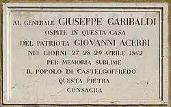 ^Memorial plaque on Gonzaga-Acerbi Palace in Mazzini Square.