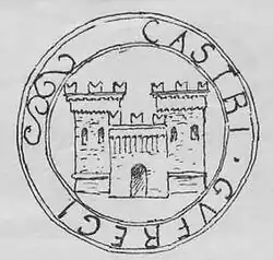 The oldest coat of arms, dated 1534, at the time of the Marquisate of Castel Goffredo, shows a "crenellated tower surmounted by a cross, with a gate and two windows" and around it the inscription Castel Guyfredo.[192]