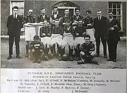 The Dundalk Great Northern Railway (G.N.R.) Football Club was established during the 1883–84 season as a rugby football club.[18] They played their final rugby match in February 1903 and in September 1903 the club switched codes to association football,[19] setting in motion its journey to become the modern-day Dundalk Football Club. The new club, known locally as 'the Railwaymen', adopted the Dundalk Athletic Grounds (a municipal facility shared by a number of sporting codes) as its home ground. At first, they played challenge matches against other teams in the area, including sides from British Army regiments garrisoned in the town, then became founder members of the DDL in 1905–06.[20] There are no records of the club being active between the 1907–08 and 1912–13 seasons, however it rejoined the local league in 1913–14.[21] The DDL was dormant during World War I, but Dundalk G.N.R. did compete in both the Irish and Leinster Junior Cup competitions of 1913–14, 1914–15 and 1916–17; while another side, Dundalk Town, competed in the 1917–18 and 1918–19 competitions.[22]