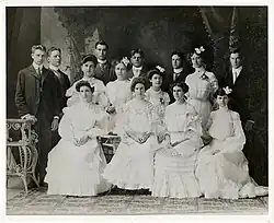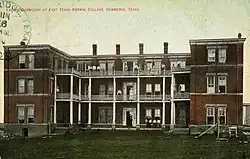 ETNC resumed operation in Commerce in September 1894 with just 35 students in a small rented store, although shortly thereafter a two-story classroom and administration building known as College Hall, as well as two dormitories were built.[6][9][12][13] At the time of the move William and Etta Mayo were the college's only two faculty members, and just 10 students followed them from Cooper to Commerce.[14] In 1899, ETNC opened a three-story dormitory for both male and female students that contained 80 rooms and could accommodate 160 students,[15] which was followed by a second, 43-room dormitory in 1904.[16] The college grew slowly but steadily during the 1890s, reaching 132 students in 1896 and 212 in 1897, all the while bolstering its faculty as funds permitted.[12] Although its tradition of "summer normals", shorter courses for active teachers seeking state certification or recertification, dated back to 1891, they grew rapidly through the 1890s; by 1907, ETNC had established a reputation as "the best attended summer institute for teachers in the state".[17]