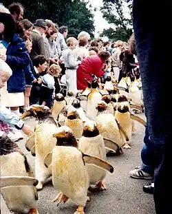 It was around this time that Edinburgh Zoo's now famous Penguin Parade was established. A zookeeper accidentally left a gate to the penguin pool open, and was followed around the zoo by a train of penguins. Visitors were so delighted with the procession that it became a regular occurrence, and today around two-thirds of the zoo's penguins parade round the park every day.[1]