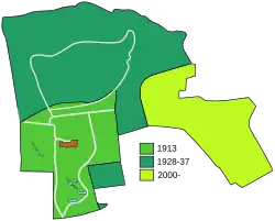 A further £8,000, raised with the help of the society's members, was set aside for the construction and stocking of the park. Initially the zoo occupied only the southernmost 27 acres (11 ha), while the land to the north was used as a golf course. The park was designed by town planner Patrick Geddes and his son-in-law Frank Mears.[7] Following Gillespie's vision, they modeled the park after the open designs of zoos like the New York Zoological Park and Hagenbeck's zoo in Hamburg. These modern zoological parks promoted a more spacious and natural environment for the animals, and stood in stark contrast to the steel cages typical of the menageries built during the Victorian era. The Scottish National Zoological Park, as it was initially called, opened to the public with a large collection of donated and borrowed animals on 22 July 1913, after only 15 weeks of work.[1][2][8] The zoo still occupies very much the same area of land today, though the park is being extensively redeveloped.[7]