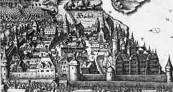 Höchst was struck by the plague in 1582. The number of plague deaths is not recorded, only the Antonite diary reports four victims among the friars. On the night of December 10/11, half of the town was destroyed in the Great Fire. The Antonite diary records this:[23]