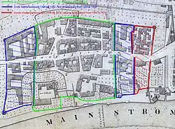 The settlement of several noble families in Höchst, who alternately occupied the post of Mainz bailiff, led to spatial and economic growth. After its destruction in 1396, the town was extended in both directions along the main street until 1432. In the west, the older Ochsenturm tower was incorporated into the new fortifications as the south-western corner. Town gates were built along the main street.[20]