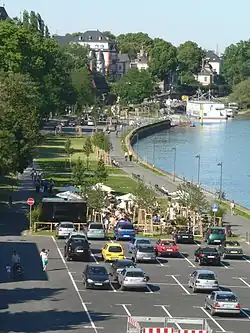 At the beginning of the 1950s, the incorporation treaty and its unfulfilled points came up for discussion again. The people of Höchst were still waiting for a connection to the Frankfurt tramway, and the contractually promised market hall, indoor swimming pool and Main Bridge had not yet been built. In 1953, Höchster citizens founded a committee with the slogan "Break Frankfurt's chains", which wanted to see the town removed from Frankfurt.[40] As the Lord Mayor of Frankfurt, Walter Kolb, lived in a side wing of the Bolongaro Palace, he was able to get a direct impression of the discontent of the people of Höchst.[41] On his initiative, the market hall and the indoor swimming pool were built and inaugurated in November 1955. The tramway was extended from Nied to Zuckschwerdtstraße in the east of Höchst. Other parts of the contract have only been fulfilled since the mid-1990s, such as the construction of a bridge over the Main in 1994 and the construction of the railroad station for Zeilsheim and Sindlingen in 2007.[42]