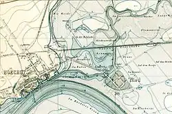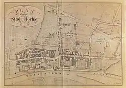 After the end of the Wars of Liberation in 1813, the Nassau government began to improve the infrastructure and reform the administration of the duchy. Höchst became the administrative seat of the Höchst district in 1816.[28] As part of the expansion of the Mainzer Landstraße, the obstructive and useless city walls and both city gates were demolished in 1816 and the main street was extended. Only the Main front of the old town fortifications remained, as there was no room for the town to expand. It still characterizes Höchst's image on the Main side today. Königsteiner Straße, which was created as part of the new town project, was extended between 1814 and 1820 as a road towards Königstein. Höchst experienced further economic and population growth. In 1822, the entry in a geography book read:[29]