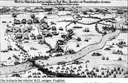 The Thirty Years' War was also a turning point for Höchst. The town was severely affected by the events of the war. On June 20, 1622, the Battle of Höchst was fought, in which the Imperial forces under Tilly defeated the Brunswickers. The town was occupied and plundered. From November 1631 to March 1632, the Swedes under Gustav II Adolf occupied the city, with a small Swedish garrison remaining until the end of 1634. On his march from Frankfurt towards Mainz, Bernhard von Weimar had Höchst captured in January 1635 and half of the city and the then Gothic castle burnt down. Elector Anselm Casimir Wambolt von Umstadt complained about this to the Emperor in a letter dated March of that year:[24]