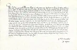 On February 11, 1355, Emperor Charles IV granted the village of Hoisten (Höchst) city rights against Frankfurt's will in a document issued in Pisa. The document, written in Latin, was addressed to Gerlach von Nassau, the sovereign and Archbishop of Mainz. For a long time, there were doubts about the legality of this document, as it was allegedly neither sealed nor signed.[13] However, the document kept in the Bavarian Main State Archives in Munich bears both the royal and imperial seal and is therefore valid.[14]