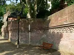 Shortly after the town was raised, the construction of a town fortification began in Höchst. The town wall, which has been partially preserved to this day, was probably built in several stages. The Limburg Chronicle does not mention a stone wall in the report on the Frankfurt attack of 1396, but rather palisades with ditches and towers:[18]