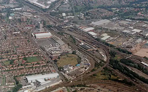 - This section of the "Y" branches at Coleshill to the east of Birmingham and routes north to just before York where it connects onto the northbound classic ECML projecting services to the North East of England and Scotland. The line from Birmingham northbound will incorporate the proposed East Midlands Hub located at Toton between Derby and Nottingham. The East Midlands Hub will serve Derby, Leicester and Nottingham. The initial plan was for the line to serve Sheffield directly via a new raised station adjacent to Tinsley Viaduct, near to Meadowhall Interchange. This met with opposition from Sheffield Council, which lobbied for the line to be routed via a spur to the site of the former Sheffield Victoria Station. It was claimed that the initial proposed route, which incorporated a viaduct 6 tracks wide along a two mile long viaduct across the Don valley would have sat on a major geological fault with flooded historic mine workings below. Sheffield Council's alternate route was rejected in favour of a route along existing tracks. The new proposed route is to connect the HS2 route to existing lines near to Clay Cross, in Derbyshire, going via Sheffield station before rejoining HS2 east of Grimethorpe.[98][99][100][101] A branch will take the line to new high speed platforms constructed onto the side of the existing Leeds station.[102][103][104] Consultation on the route is planned to take place in 2014, with the line is expected to be built by 2033.[37] The Leeds branch would diverge just north of Coleshill and head in a north-easterly direction roughly parallel to the M42 motorway. A high speed spur line will serve Leeds, with the main line of the branch heading north-east to meet the East Coast Main Line near York.[105]