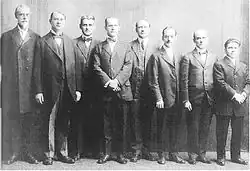 At the corporation's annual general meeting on January 6, 1917, Joseph Franklin Rutherford, the Society's legal counsel, was elected as Russell's successor, with new by-laws passed to strengthen the president's authority.[71] Within months, four of the Society's seven directors claimed he was acting without consulting the board and described him as "dogmatic, authoritarian and secretive".[72][73][74][75] A directors' meeting in June proposed returning control of the Society to the board,[76] but at a stormy five-hour meeting on July 17, 1917, Rutherford announced he had appointed four new directors to replace the four who had opposed him, claiming they had no legal status on the board because of conflict with Pennsylvania law.[77][78]