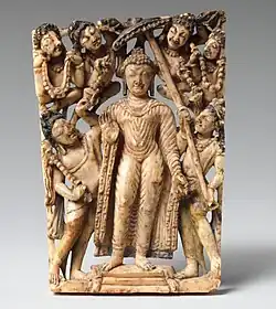 The Alchon Huns under Toramana crossed over the Hindu Kush mountains and conquered large parts of western India including Kashmir.[29] His son Mihirakula (c. 502–530 CE) led a military campaign to conquer all of North India. He was opposed by Baladitya in Magadha and eventually defeated by Yasodharman in Malwa. After the defeat, Mihirakula returned to Kashmir where he led a coup on the king. He then conquered of Gandhara where he committed many atrocities on Buddhists and destroyed their shrines. Influence of the Huns faded after Mihirakula's death.[30][31]
