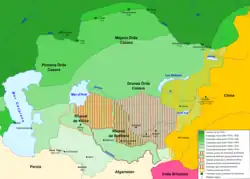 After the end of the arid period at the beginning of the first millennium BC nomadic populations migrated into Kazakhstan from the west and the east, repopulating abandoned areas. They included several Indo-Iranians, often known collectively as the Saka.[2][3]