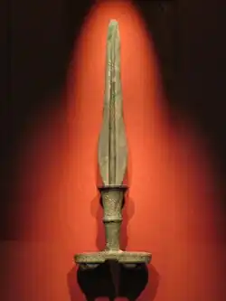 The Bronze Age in Korea is often held to have begun around 900–800 BC,[5] though the transition to the Bronze Age may have begun as far back as 2300 BC.[6] Bronze daggers, mirrors, jewelry, and weaponry have been found, as well as evidence of walled-town polities. Rice, red beans, soybeans and millet were cultivated, and rectangular pit-houses and increasingly larger dolmen burial sites are found throughout the peninsula.[36] Contemporaneous records suggest that Gojoseon transitioned from a feudal federation of walled cities into a centralised kingdom at least before the 4th-century BC.[37] It is believed that by the 4th century BC, iron culture was developing in Korea by northern influence via today's Russia's Maritime Province.[38][39]