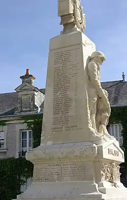 During the First World War, the town of Le Lude provided shelter to approximately sixty Belgian and French refugees from the front regions. Additionally, the town's hospital provided care for recuperating wounded military personnel.[40] In 1916, young recruits from the 117th Infantry Regiment were stationed in Le Lude,[41] followed the next year by a detachment of 700 men from the 150th Infantry Regiment. By the end of 1917, American troops had been stationed at Luna Park for several weeks, occupying the football field in particular.[e 3] The conflict resulted in the deaths of 123 Ludois.[42] As was the case with numerous other French communes, Le Lude erected a war memorial to honor the fallen after the war. The monument, created by sculptor Robert Gaullier, features an obelisk topped with a war cross and depicts a soldier with a child.[43] It was inaugurated in the town square on October 23, 1921, in the presence of various dignitaries, including High Commissioner of the Ministry of War Henry Paté, General Vuillemot, Cardinal Dubois, and Prefect Alfred Stecke.[e 4]