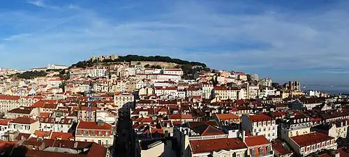 Al-Us̲h̲būna was renovated and rebuilt in the customary pattern of the Middle Eastern city:[82] high walls (muralhas) surrounding the main buildings, which were a large mosque, a castle at the top of the hill (which in modified form became the Castelo de São Jorge), a medina or urban centre, and an alcácer, or fortress-palace for the governor.[83] The Alfama neighbourhood grew next to the original urban core. The citadel of al-Madan, now the city of Almada, was built on the south bank of the Tagus to protect the port.
