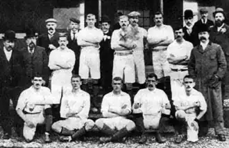 The summer of 1887 turned out to be one of great change for the infant club, with change happening on three fronts. For a start, the club had once again been turfed out of their playing location and needed a new area to call their home. After some searching, one was eventually identified near to a railway viaduct in Ardwick. While the field initially was unimpressive, being uneven and muddy, either necessity or ambition finally won the day and a rent was agreed upon at a rate of £10 for seven months; club historian Gary James arguing that the disappointment of the previous five grounds instilled in the club's decision-makers a determination to go the extra distance this time to build a lasting stadium rather than continue to play on and be evicted from facility-less fields for the rest of their existence.[9] The new location was close by the Hyde Road Hotel, and the club soon struck up a good relationship with the hotel's landlord, Stephen Chesters Thompson, who allowed them use of his hotel's facilities in exchange for the club officially basing themselves there, and later on receiving the licence to run all of the new stadium's bars. It was to be the start of a long link between the landlord and the club, and the businessman would work his way into the club's leadership before long. Another offshoot of the link with the Hyde Road Hotel was to be the club acquiring its first (recorded) nickname - they would continue to be known as The Brewerymen for some time.[9] The first match at the brand new Hyde Road stadium was chosen to be against Salford A.F.C. on 10 September 1887, but the "grand opening" of the new ground was a non-event as Salford failed to turn up.[10]