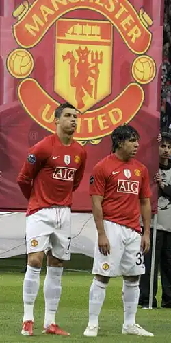 In the following summer transfer window, star player Cristiano Ronaldo was sold to Real Madrid for a world record £80 million and Carlos Tevez joined local rivals Manchester City, after his loan spell came to an end.[45] On 28 February 2010, Manchester United defeated Aston Villa 2–1 at Wembley Stadium to retain the League Cup, the first time the club had successfully defended a knockout cup competition.[20] However, they were knocked out of the Champions League in the quarter-finals by Bayern Munich on away goals,[46] and were runners-up in the Premier League, finishing one point behind Chelsea.[47]