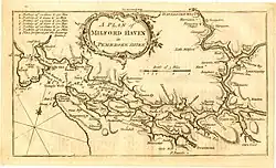 By the late 18th century, the two creeks which would delimit the future town of Milford's boundaries to the east and west, namely Hakin and Castle Pill, were being used as harbours for ships to load and unload coal, corn and limestone.[22] A ferry service to Ireland operated from Hakin around the start of the 20th century, although this ceased in the early 19th century.[23] Although surrounding settlements at Steynton, Thornton, Priory, Liddeston and Hubberston/Hakin were established, they were little more than hamlets. The only man-made structures on the future site of Milford were the medieval chapel, and Summer Hill Farm, and its accompanying cottages.[23]