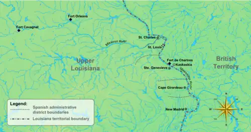 To better govern the region of Missouri, the Spanish split the province into five administrative districts in the mid-1790s: St. Louis, St. Charles, Ste. Genevieve, Cape Girardeau and New Madrid.[38] Of the five administrative districts, the newest was Cape Girardeau, founded in 1792 by trader Louis Lorimier as a trading post and settlement for newly arriving Americans. The largest district, St. Louis, was the provincial capital and center of trade; by 1800, its district population stood at nearly 2,500. Aside from Carondelet, other settlements in the St. Louis district included Florissant, located 15 miles northwest of St. Louis and settled in 1785, and Bridgeton, located 5 miles southwest of Florissant and settled in 1794. All three settlements were popular with immigrants from the United States.[39]