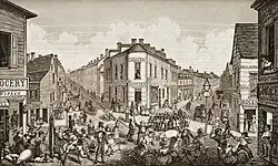Immigrants provided a ready resource for those opposing abolition of slavery. These were often led by gangsters from the Bowery and Five Points. On July 7, 1834, a series of riots started, terminating in the destruction of St. Phillip's Negro Church on Center Street and generally terrorizing the Five Points area.[5]