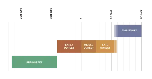 The history of Nunavut covers the period from the arrival of the Paleo-Eskimo thousands of years ago to present day. Prior to the colonization of the continent by Europeans, the lands encompassing present-day Nunavut were inhabited by several historical cultural groups, including the Pre-Dorset, the Dorsets, the Thule and their descendants, the Inuit.