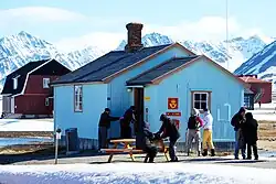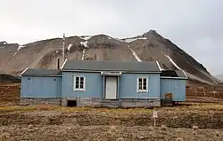 The Geophysical Institute of Tromsø established a geophysical station at Kvadehuken in 1920, consisting of a small hut and a radio mast allowing communication via Ny-Ålesund. It carried out meteorological surveys and geomagnetic field measurements and was manned by four men.[15] Two of these died in February 1922 while attempting to rescue a trapper. The station was closed in 1924 due to lack of funding.[16] The Church of Norway never established a presence in Ny-Ålesund, although the minister at Svalbard Church in Longyearbyen visited Ny-Ålesund irregularly.[17] Most of the children in town were below school age. However, during the 1920–21 winter there were 23 children in town and an improvised school was taken into use for the year.[18]