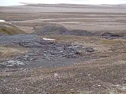 The first fatal mining accident took place in the Ester Mine on 16 December 1926, killing two miners. Four men were killed on 20 April 1927 when a 130-meter (430 ft) section of a shaft in the same mine collapsed after a gas explosion.[31] An accident on 16 August 1929 killed to miners,[32] and from that season the ministry decided to terminate the subsidies and halt production due to the company's lack of profitability.[33] The company hired three to four men to stay in the town each winter, including a telegraphist.[34]