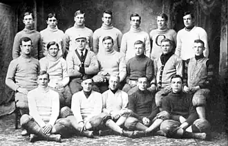 In the mid-1880s the growing fever of the Walter Camp-style of football, formulated between 1880 and 1883 among colleges of the future Ivy League, reached Columbus, Ohio. Abortive early attempts at forming a team occurred in 1886 and 1887. Future Nebraska governor Chester Hardy Aldrich captained the team in 1886, and Stevens Institute of Technology alumnus Joseph Frederick Firestone led the attempt in 1887.[1] The Buckeyes' first game, played on Saturday, May 3, 1890, at Delaware, Ohio, against Ohio Wesleyan University, was a victory, but other projected spring games could not be arranged. The Delaware County Historical Society has set a marker at the site of that game. George Cole, an undergraduate, is generally given credit for organizing the first intercollegiate team at Ohio State,[2] although more recent scholarship has put that claim in doubt.[3] Agreed by all is that by the fall of 1890 Cole persuaded Alexander S. Lilley to coach the squad. Lilley brought in a renowned Princeton fullback and soon-to-be coach of the Purdue Boilermakers, Knowlton L. "Snake" Ames,[4] to familiarize the team with fundamentals. Play resumed in November, with home games played at Recreation Park (near the current Schiller Park in south Columbus),[5] but Ohio State lost all three. The next year representatives met with counterparts from Adelbert, Denison, Buchtel, and Kenyon Colleges to agree to various terms and laid the groundwork for the informal "Big Six" conference of Ohio colleges.[6] Throughout its first decade nearly all of Ohio State's opponents were in-state teams. In 1892 Jack Ryder became Ohio State's first paid coach, earning $15 a week during a ten-week season. After losing his first game, against Oberlin College and its new coach John Heisman, Ryder compiled a 22–22–2 record.[7] Over the next eight years, under a number of coaches, the team played to a cumulative record of 31 wins, 39 losses, and 2 ties. Home games were moved to a field on campus at Neil and 11th Avenues, then in 1898 to Ohio Field at High Street and Woodruff Avenue. Play was brutal and dangerous but continued to grow in popularity. The first game against Michigan, in Ann Arbor, was a 34–0 loss in 1897, a year that saw the low point in Buckeye football history with a 1–7–1 record.