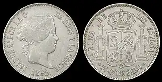 In order to remedy this damage in the monetary situation, Queen Isabella II issued a decree in 1857 ordering the founding of the Casa de Moneda de Manila in the Philippines in order to coin gold 1-, 2- and 4-peso coins according to Spanish standards (the 4-peso coin being 6.766 grams (0.2387 oz) of 0.875 gold). The first gold coins were minted in 1861. In the same year, a royal decree ordered the minting of 50-, 20- and 10-centimo silver coins out of Latin American coins also according to Spanish standards (with 100 centimos containing 25.98 grams (0.916 oz) of 0.900 silver). The price of silver has since gone down and the first silver coins were minted in 1864.