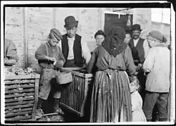 In 1895 government inspectors found a child working at a dangerous machine. The child told inspectors that his father was injured at the machine and would lose his job if his son did not work. Illinois labor inspectors needed Polish translators to collect evidence because some child workers, in 1896, were unable to answer questions, like "What is your name?" and "Where do you live?", in English.[89] Reports also found that parents falsified child birth records to bypass laws prohibiting work for children under 14 years old. Under investigations with the children themselves, it was found that work commonly started at age 10 or 11.[90] School records certifying that children could read and write by age 16 were easily obtained by Catholic parish schools after confirmation.[91] Because of vigorous State prosecution against factories, from 1900 to 1914 the number of children under 16 working in urban Illinois fell from 8,543 to 4,264.[92]