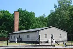 There were also several subcamps of the Stutthof and Ravensbrück concentration camps, whose prisoners were Polish, Jewish, Ukrainian, French, Russian, Yugoslav, Italian, Croatian, Romani, Lithuanian, Latvian, German, Greek,[69][70] and several Nazi prisons with numerous forced labour subcamps in the region. Połczyn-Zdrój was the location of a Germanisation camp for kidnapped Polish children.[71] Unieszyno and Police housed camps for Sinti and Romani people (see Romani Holocaust).[72][73]