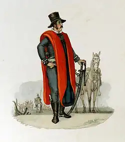 Various names were given to this population, among them faeneros, corambreros, índios vagos, gaudérios, guascas, and gauchos. They lived in bands on their own, eating meat and drinking mate and moonshine, dressed in simple clothing adapted to constant life on horseback, facing days of intense cold in the winters, having to sleep, as a rule, in the open air. They were always a danger to the ranchers, especially the poorer ones, and were constantly involved in raids with the Spanish on the border. Their relations with the kingdom's officials were ambiguous. On the one hand, they competed for the prey of loose cattle, but they could also be hired to do the same service for a lord or to perform military tasks with an official detachment. In 1803, their number reached four thousand in a total population of thirty thousand.[3][14]