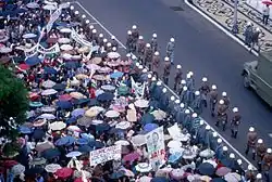 The military movement was consolidated through force. Immediately there were reactions in various spheres, including anti-coup street demonstrations, but all were violently repressed. The mayor of Porto Alegre, Sereno Chaise, was arrested, along with hundreds of people. However, they were mostly released in the first week. Repression remained the usual resource for preserving the new order, justified as a national security measure, and soon there were more arrests, along with the closing of newspapers, peasant leagues, unions, and the Student Union, revocation of politicians, extinction of parties and purges of professors from universities. It also created a system of indirect elections for governor. The main theoretician of the regime was the Rio Grande do Sul general Golbery do Couto e Silva, who became head of the National Intelligence Service, although he was not a hardliner. Until 1968, the students remained the main force of opposition to the military, challenging them in several confrontations. That same year Institutional Act 5 was created, which unleashed a new cycle of impeachment, generalized censorship of the press, and the officialdom began to use torture and death as a means of silencing opposing voices.[3][4]