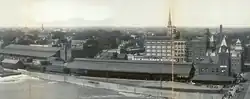 The period 1860 to 1900 saw Rochester grow from a city of 48,000 to a city of 162,800, with a 1900 rank of 24th largest in population, down from 18th in 1860. During this period the city expanded dramatically in area on both sides of the Genesee River, as well as annexing parts of the towns of Brighton, Gates, Greece and Irondequoit. Also founded during this period were Bausch & Lomb by John Jacob Bausch and Henry Lomb, Eastman Kodak by George Eastman, Western Union Telegraph by Hiram Sibley and Don Alonzo Watson, Gleason Works by William Gleason, and R.T. French Company by Robert French. Other important industries that developed during this period were clothing manufacturing, shoe manufacturing, brewing and machine tools. In 1875, Rochester's first city hall opened at Fitzhugh and the Erie Canal (now Broad Street). It was built at a cost of over $335,000 on the site of the First Presbyterian Church, which had burned to the ground in 1869. The church sold the lot to the city for $25,000. This city hall housed city government until 1978.