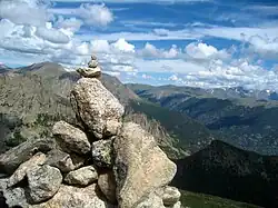 There were three main trails used by the Ute and Arapaho people to travel between Middle Park and Estes Park. One was called Dog Trail, because the Arapaho had dogs pull travois over the snowy trail, is now called Fall River trail. Child's trail has a spot where children had to get off their horses due to the steep terrain; that trail is now Ute Trail and Trail Ridge Road. Big Trail, which went over Flattop Mountain to the Kawuneeche Valley, was used by fast-traveling warriors.[21] Stone cairns were used by the Arapahos and the Utes to mark the forest trails.[22]