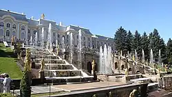 Peter was impressed by the Versailles and other palaces in Europe. His official palace of a comparable importance in Peterhof was the first suburban palace permanently used by the Tsar as the primary official residence and the place for official receptions and state balls. The waterfront palace, Monplaisir, and the Great Peterhof Palace were built between 1714 and 1725.[7] In 1716, Prussia's King presented a gift to Tsar Peter: the Amber Room.[8]