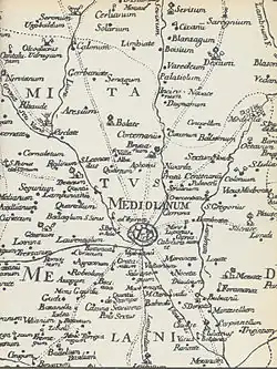 The name Sesto is given by the distance in miles from Milan in the Roman period, ad sextum lapidem, i.e., at the sixth milestone,[5][6] along an ancient Roman road that started from what would become Porta Nuova, continued along Via Manzoni, reached Greco to arrive in Sesto via the present Riccio and Cavallotti streets, to the center of the village and from there continued to Monza.[7]