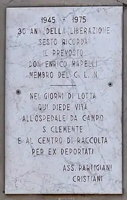 On the night of April 24-25, the first partisan groups began to descend from the mountains, making contact with the factory GAPs and together with them occupying the factories to preserve them from possible devastation by the retreating Germans. These were the days of general insurrection: workers, citizens, men and women poured into the streets of Sesto, waving tricolored flags and extolling freedom. Pirelli and Breda, whose neighboring factories covered a perimeter of more than ten kilometers, were occupied and garrisoned by workers in arms. Nazi-Fascist resistance was almost nonexistent yet tenacious, resulting in brief clashes of republican troops at Ercole Marelli and Pirelli. Snipers in the city and around the factories were quickly defeated. The partisans killed in these clashes were four and dozens were the wounded assisted in the field hospital activated by Don Mapelli in the parish kindergarten, near the San Luigi oratory.[62] It was from the oratory, the permanent headquarters of the C.L.N., that a delegation left on April 26 to occupy the town hall and set up an emergency town council chaired by Rodolfo Camagni, an early anti-fascist.[64]