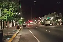 Downtown Shreveport at night, showing Streetscape-enhanced sidewalks.