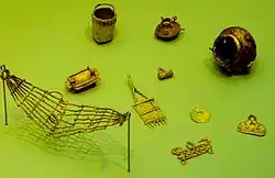 The Muisca were known as "The Salt People", thanks to their extraction of and trade in halite from brines in various salt mines of which those in Zipaquirá and Nemocón are still the most important. This extraction process was the work of the Muisca women exclusively and formed the backbone of their highly regarded trading with other Chibcha-, Arawak- and Cariban-speaking neighboring indigenous groups.[26][27] Trading was performed using salt, small cotton cloths and larger mantles and ceramics as barter trade.[28] Their economy was agricultural in nature, profiting from the fertile soils of the Pleistocene Lake Humboldt that existed on the Bogotá savanna until around 30,000 years BP. Their crops were cultivated using irrigation and drainage on elevated terraces and mounds.[27][29][30] To the Spanish conquistadors they were best known for their advanced gold-working, as represented in the tunjos (votive offer pieces), spread in museum collections all around the world. The famous Muisca raft, centerpiece in the collection of the Museo del Oro in the Colombian capital Bogotá, shows the skilled goldworking of the inhabitants of the Altiplano. The Muisca were the only pre-Columbian civilization known in South America to have used coins (tejuelos).[31]