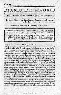 El Diario Noticioso, Curioso, Erudito, Comercial y Político was the first daily publication in Spain. It consisted of two sections, one for spreading the news, including opinion pieces that were often translations from the French, and another containing economic information, where sales, rentals, offers, demands, etc. were announced. On 17 January 1758, by royal privilege, Manuel Ruiz de Uribe y Compañía was granted permission to publish it in Madrid. Its first issue was dated 1 February 1758.[20] It was edited by Francisco Mariano Nipho, a restless, erudite, multi-subject author of encyclopedic curiosity, who has come to be considered the first professional journalist in Spanish literature and who published almost a hundred works, twenty of which were periodicals. In 1788, the Diario Noticioso, Curioso, Erudito y Comercial, Político y Económico changed its title to Diario de Madrid.[17]