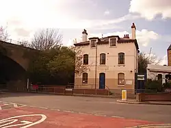These former coal offices on a railway bridge over the Gospel Oak to Barking railway (at the junction of Stapleton Hall Road and Ferme Park Road) were in use until recently as a small dwelling house and a cobblers' shop. They were demolished in autumn 2012 to be replaced by new housing.