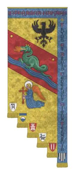 Terni was one of the first cities to adopt the consular and arengo system of the people. In 1159, at the beginning of the conflict between Frederick Barbarossa and Alexander III, the city's development had to come to a halt due to the feudal investiture in favor of the brothers of Cardinal Ottaviano Monticelli (of noble lineage, his household being that of the Cesi family of Narni), imposed by the emperor, who elevated the cardinal to the role of antipope. To further the antipope's kinship, Frederick I endowed the two brothers of Cardinal Octavian with the feudality of Terni. The people of Terni managed, with the help of the legitimate pope, to "shake them off."[22] A few years later, although the city managed to free itself and return to normality, its early years as a medieval municipality were shaken by a second shock in March or April 1174, when Terni - accused of not paying the taxes due[23] - was destroyed by the army of the imperial legate Archbishop Christian of Mainz, Frederick Barbarossa's most ruthless collaborator in subduing pro-papal cities.[note 11] Only the decisive annexation of the entire Duchy of Spoleto by Pope Innocent III in 1198 succeeded in making Terni a piece of the Patrimony of St. Peter in Tuscia. In 1218, Honorius III[24] reconstituted the Cathedral Chapter in the church of St. Mary of the Assumption, but endowed it with very little territorial jurisdiction, exposed to the claims, on the one hand of Narni, on the other of Spoleto, which was supported by the Roman families, especially the Crescenzi, who at that time set upon Narni for their incursions or claims in Umbria, especially in the basin that had always been Terni's domain.[24]